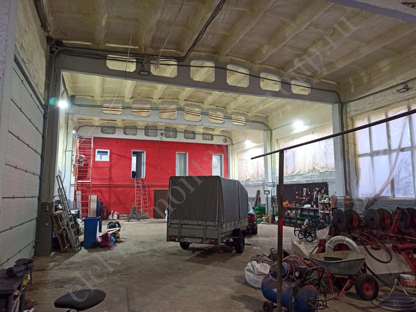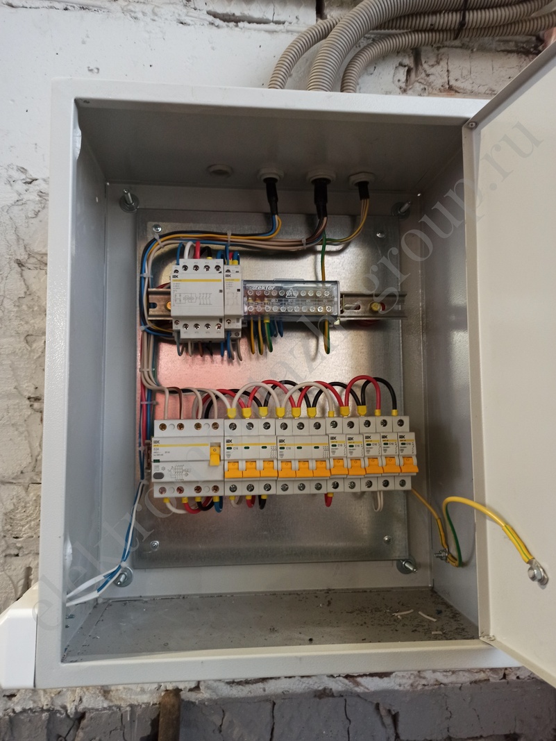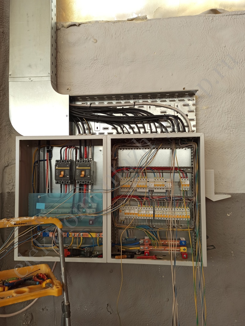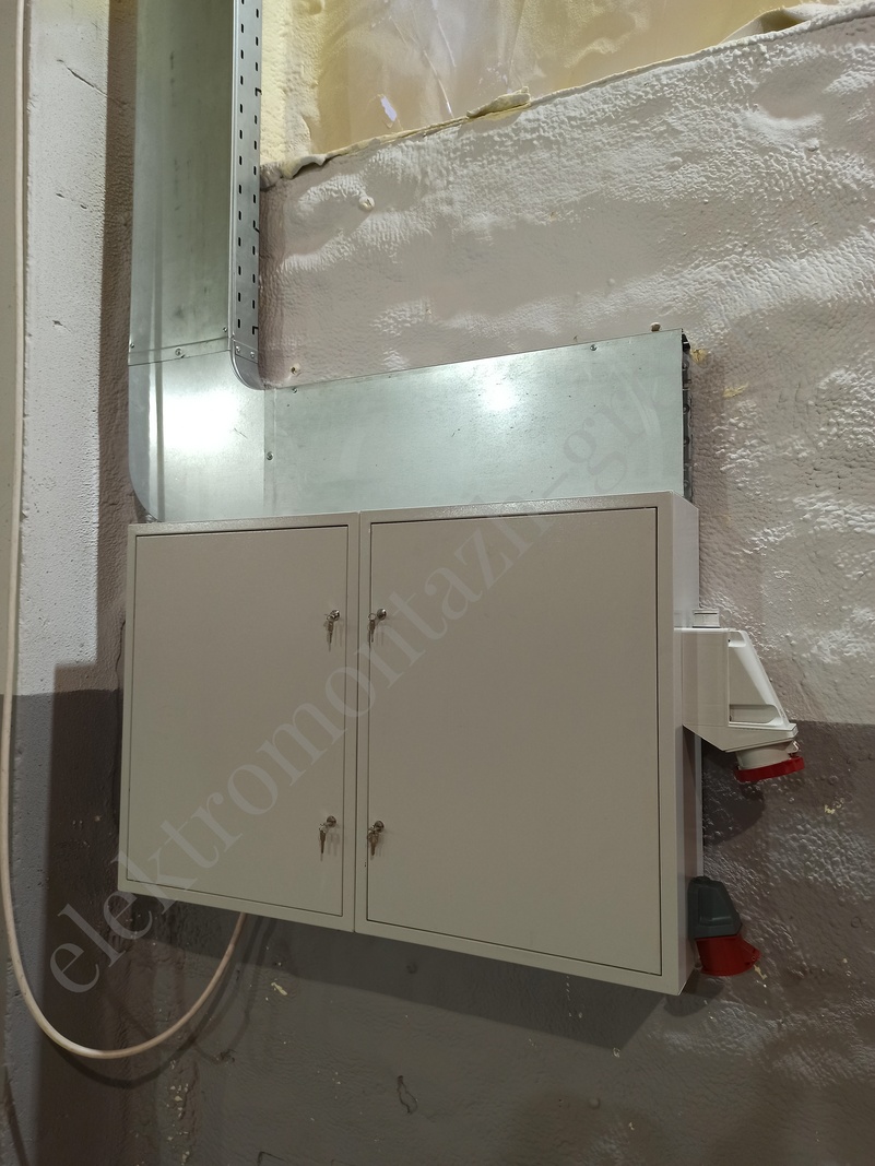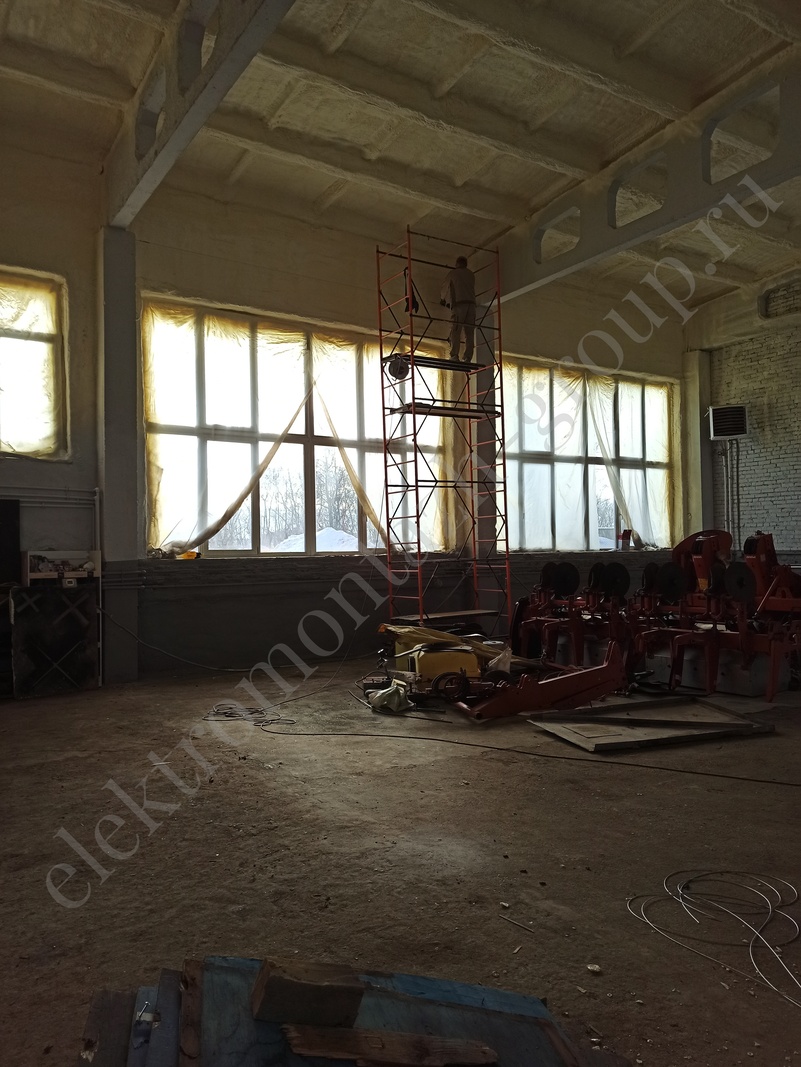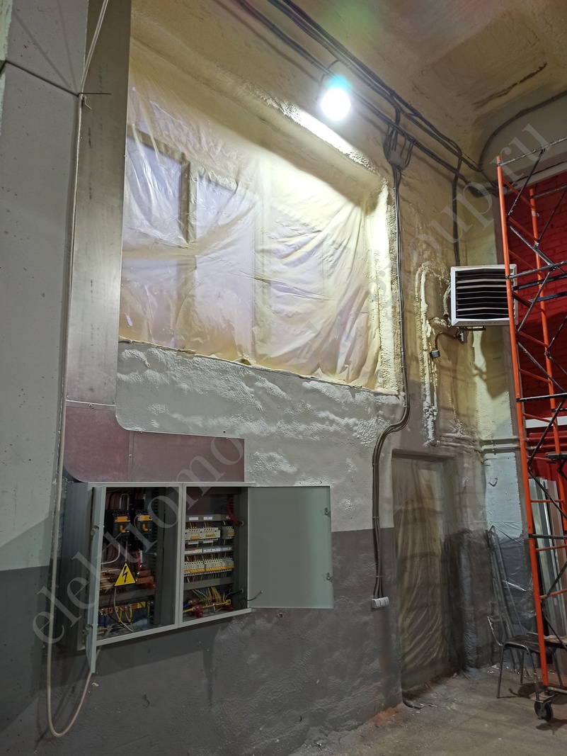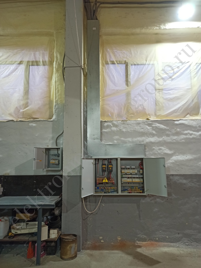 Электромонтаж в производственном помещении в посёлке Литвиново Щелковкой области. Выполнены работы по вводу силового кабеля в цех, сборка ВРУ на 150 кВт, разводка кабелей по воздуху в цеху, над рабочими зонами смонтированы дополнительные щиты с возможностью добавления силовых розеток и освещения, подключён насос и осушитель Berg на 30 кВт для пескоструйных работ, жилая зона выполнена под ключ, наружная прокладка кабелей в коробах.