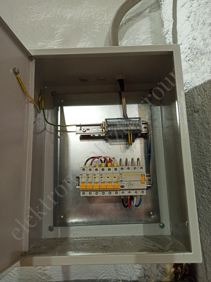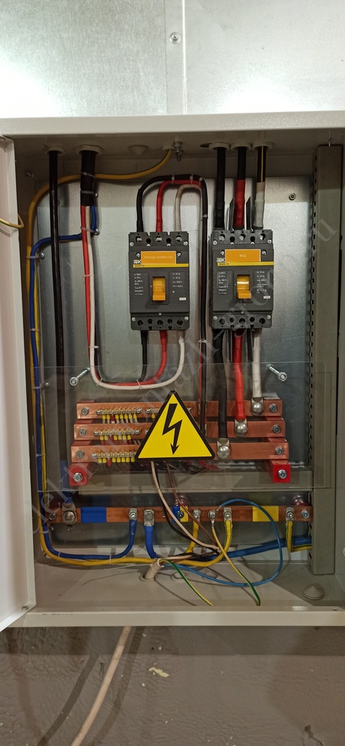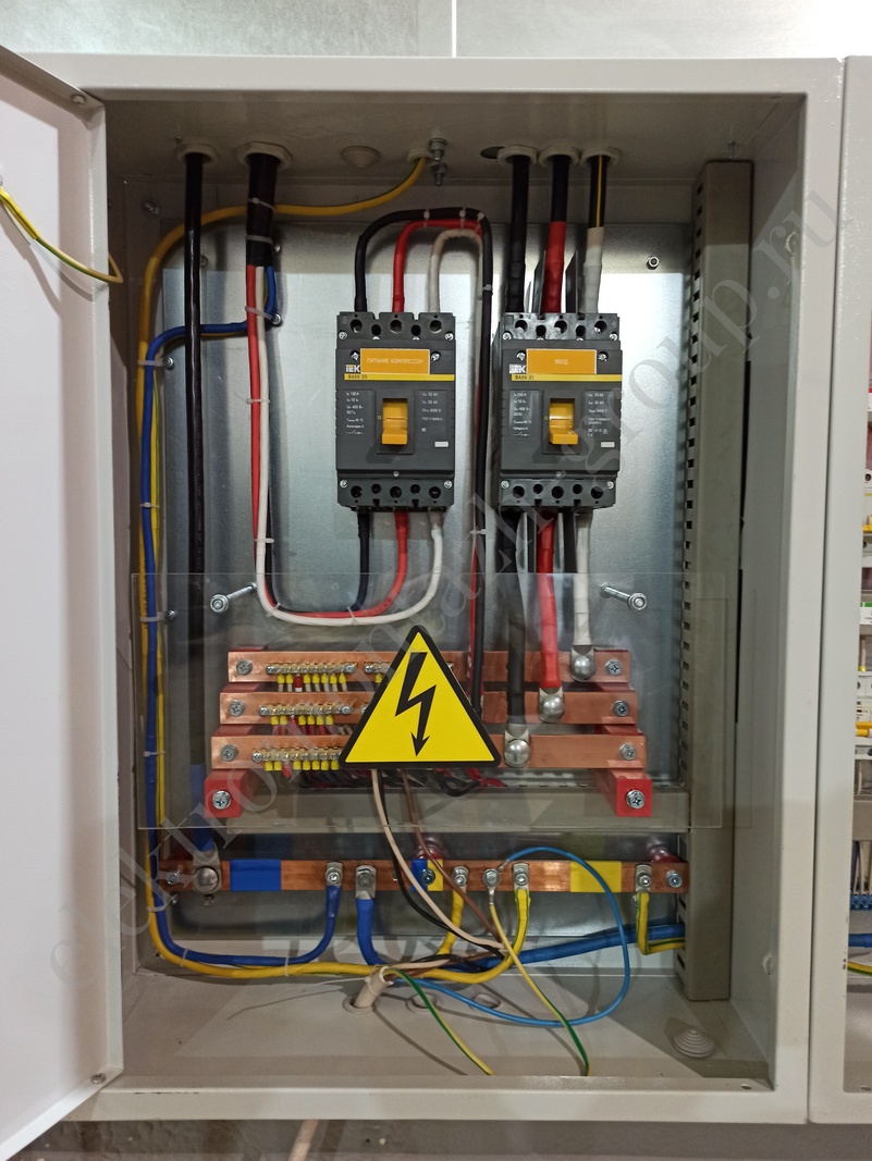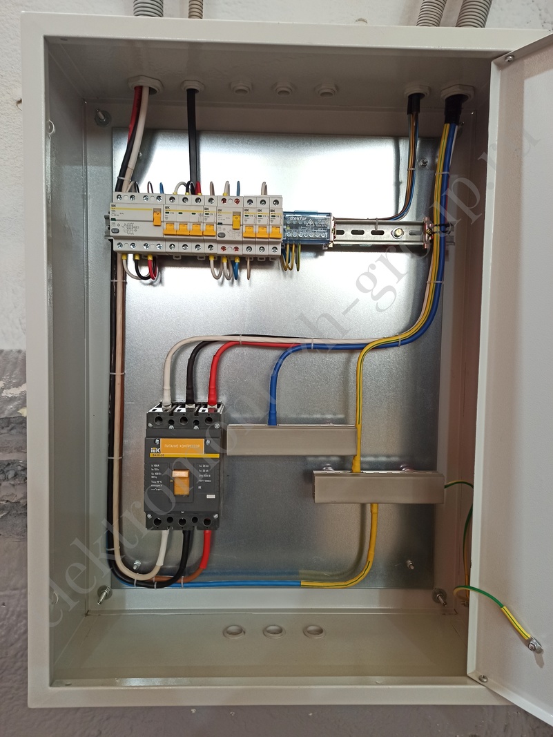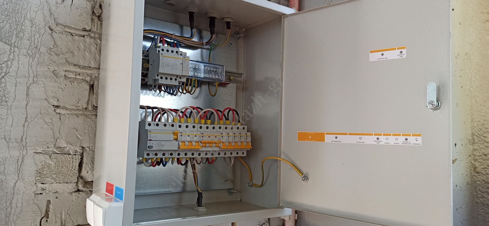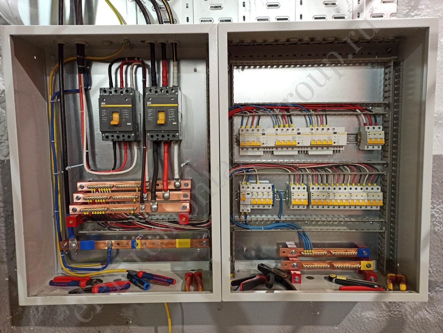 Электромонтаж в производственном помещении в посёлке Литвиново Щелковкой области. Выполнены работы по вводу силового кабеля в цех, сборка ВРУ на 150 кВт, разводка кабелей по воздуху в цеху, над рабочими зонами смонтированы дополнительные щиты с возможностью добавления силовых розеток и освещения, подключён насос и осушитель Berg на 30 кВт для пескоструйных работ, жилая зона выполнена под ключ, наружная прокладка кабелей в коробах.